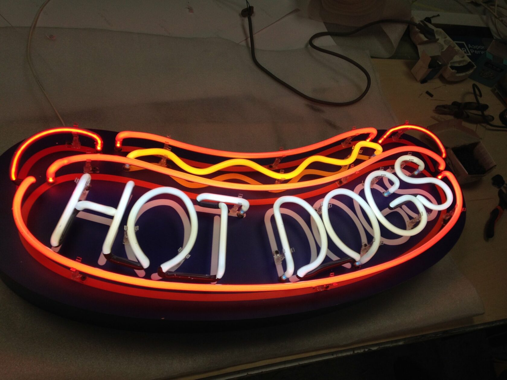 После изготовления трубок они соединяются с электродами, которые обеспечивают подачу электрического тока. В данном случае надпись «HOT DOG» выполнена с использованием отдельных букв, каждая из которых также содержит неоновую трубку.