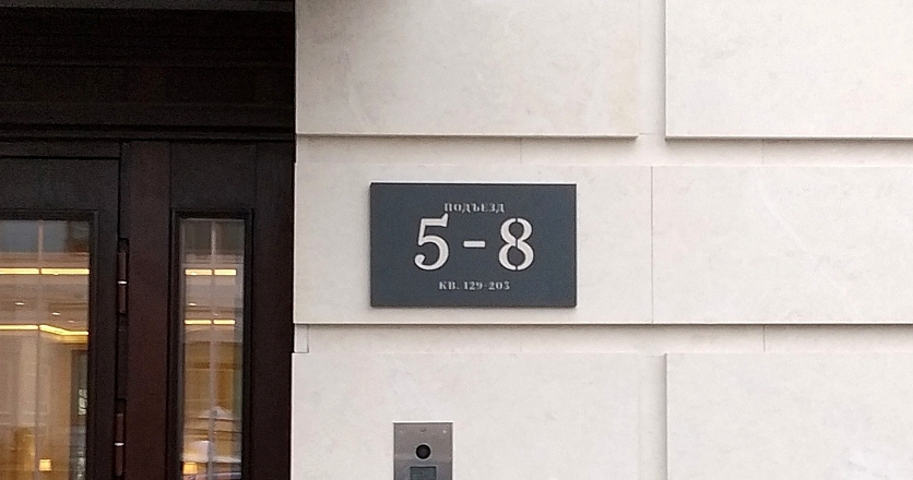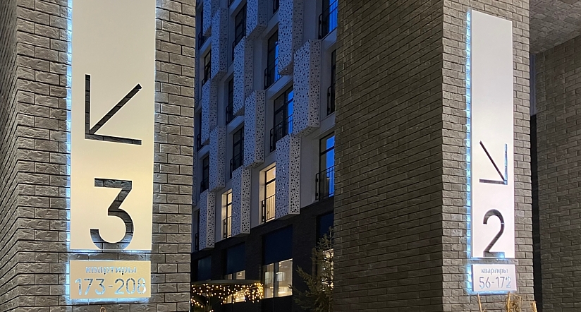 Заказчик — управляющая компания жилого комплекса — поставил задачу изготовить таблички-указатели для колясочных, которые органично дополняют архитектуру фасадов и вписываются в концепцию оформления жк.