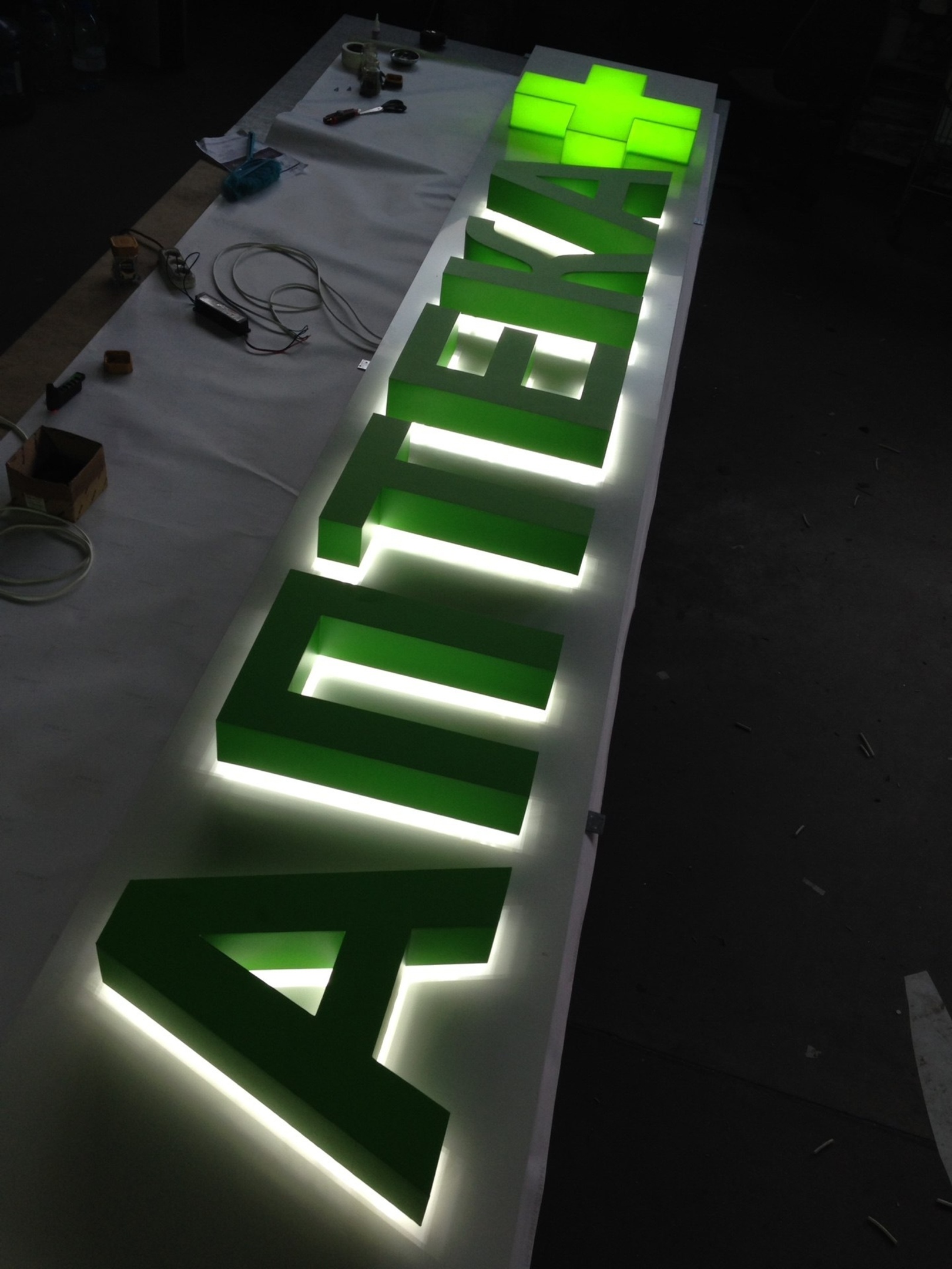 Для подсветки используется светодиодная лента, которая размещается внутри конструкции. Лента подключается к источнику питания через трансформатор, обеспечивая равномерное освещение букв. Светодиоды выбираются с учетом яркости и цветовой температуры, чтобы вывеска выглядела эффектно в любое время суток.