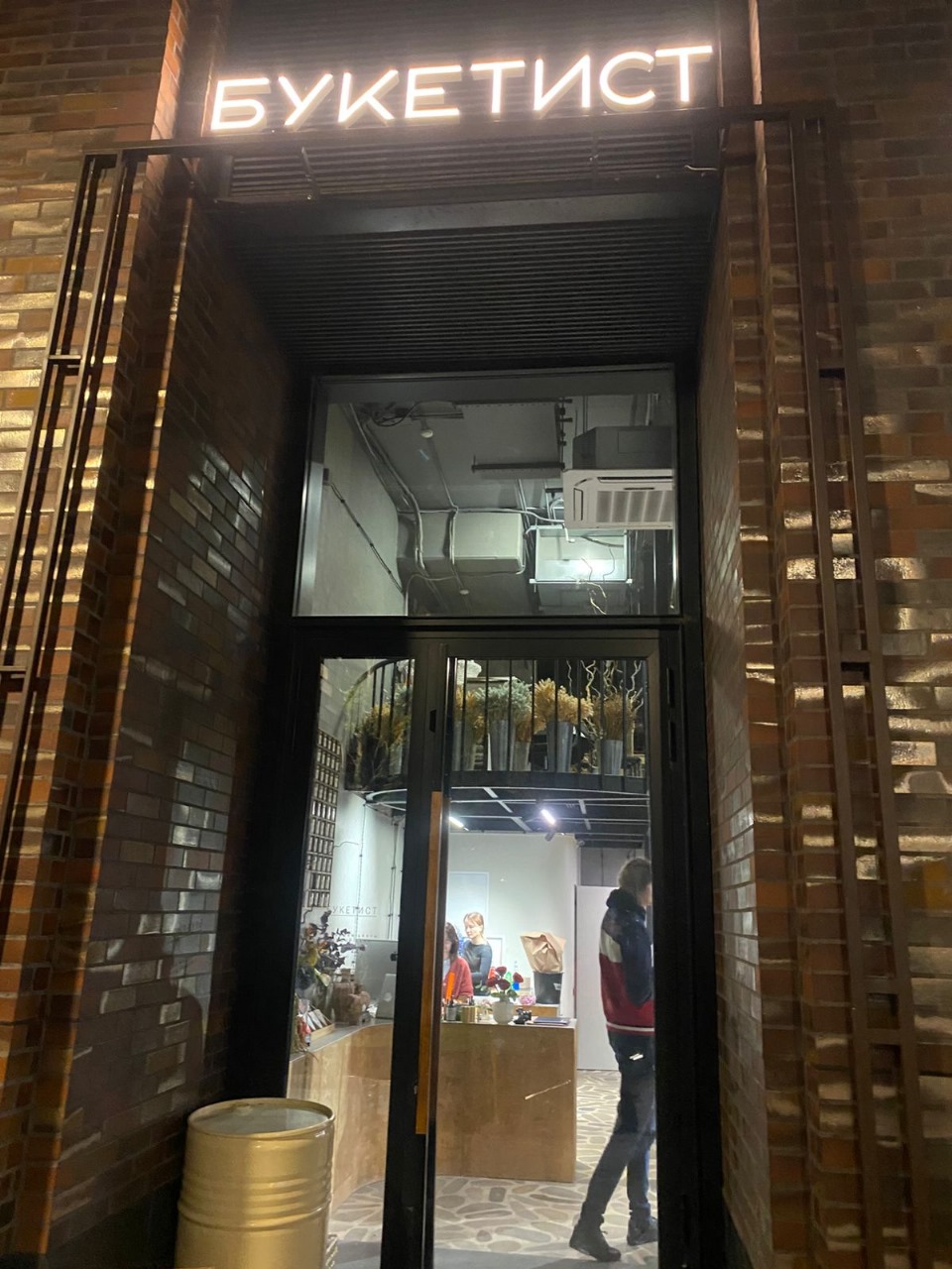 На встрече с клиентом уточнили размеры места установки, бюджет и требования к типу и дизайну объемных букв с комбинированной подсветкой. Вывеска «БУКЕТИСТ» выполнена в современном стиле с использованием объемных букв и комбинированной подсветки. Буквы имеют четкую геометрическую форму, что подчеркивает их объемность. Подсветка реализована с использованием светодиодов, которые создают эффект свечения как лицевой части букв, так и их боковых граней. Это делает вывеску яркой и заметной как днем, так и ночью.