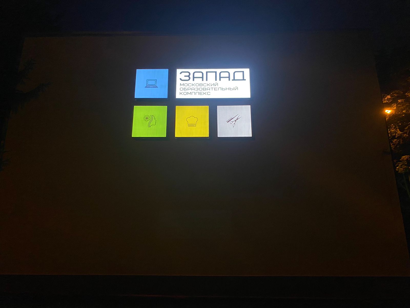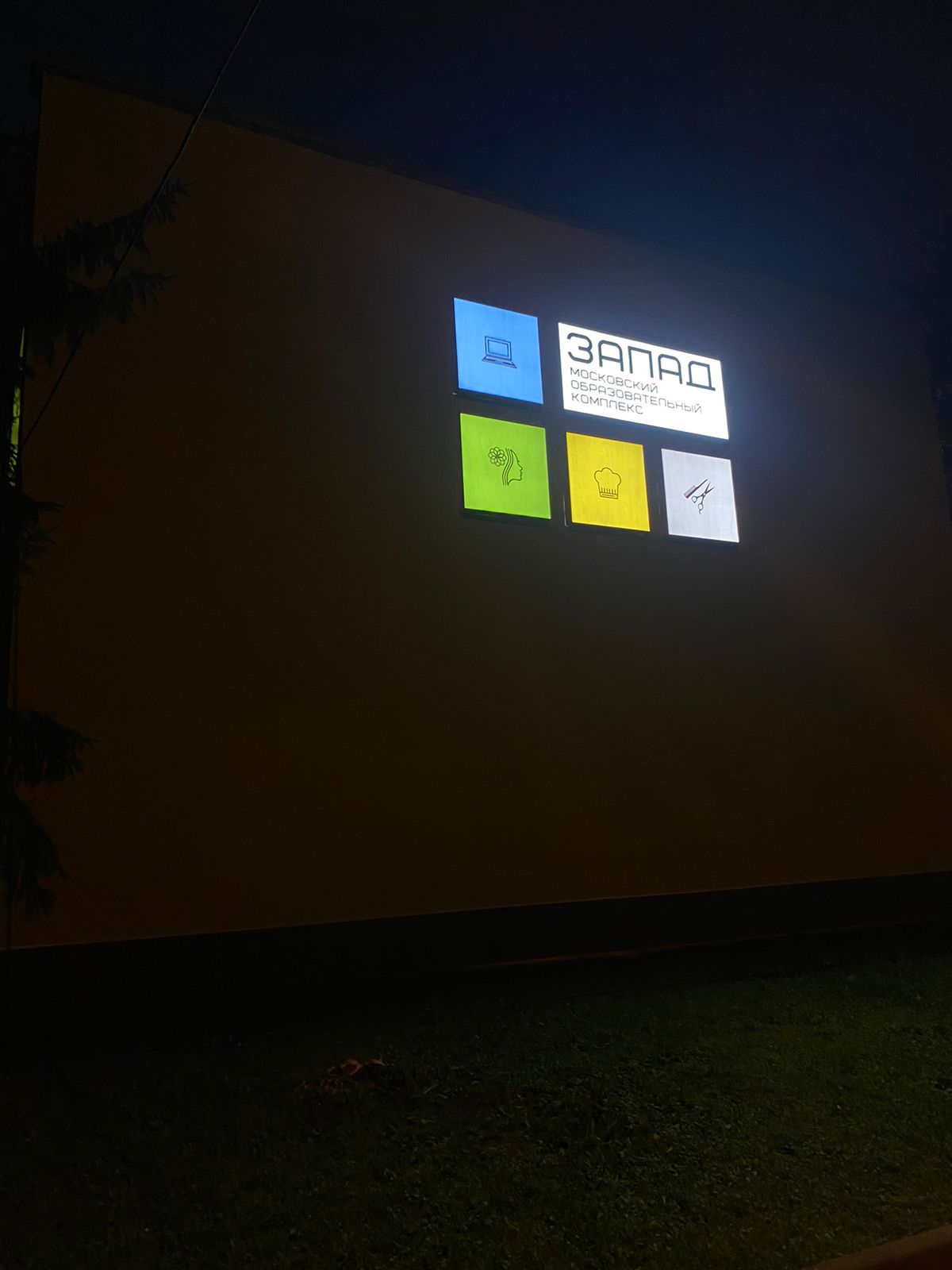 Прямоугольный короб с баннерной тканью с подсветкой. Для него была сделана каркасная металлическая рама, а на нее — натянут светорассеивающий баннер. Торцы были закрыты пластиковым профилем.