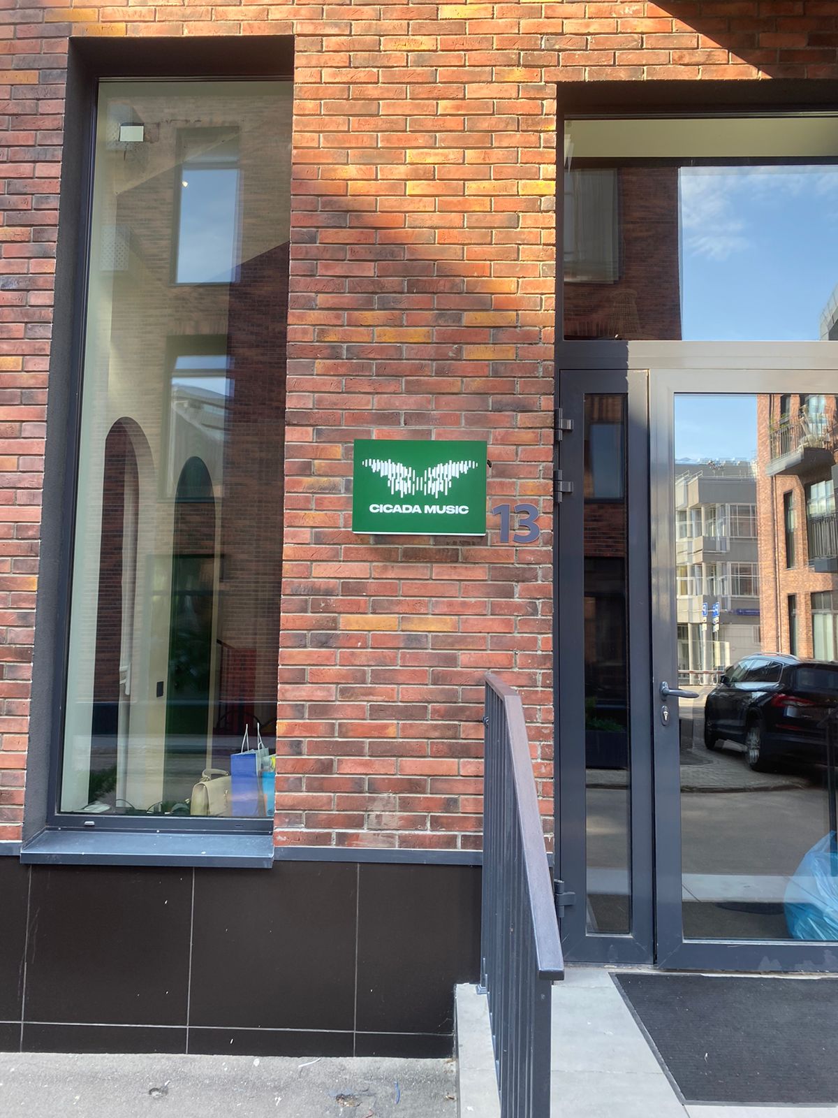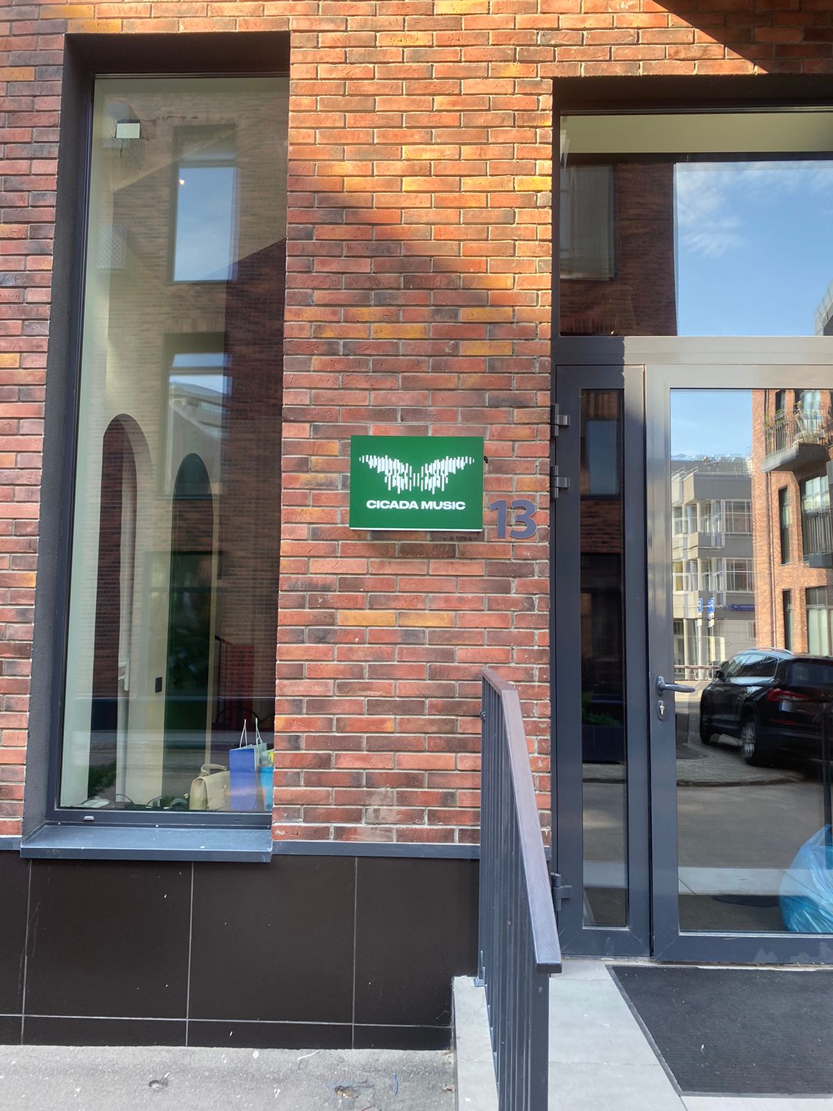 На встрече с клиентом уточнили размеры места установки (на торце), бюджет и требования к типу и дизайну светового короба с баннером. Дизайнеры предложили несколько вариантов, и клиент выбрал прямоугольного короб с баннерной тканью и подсветкой размерами 10х15см. При помощи 3D-макета определились с небольшим размером короба, печать названия студии и небольшого логотипа.