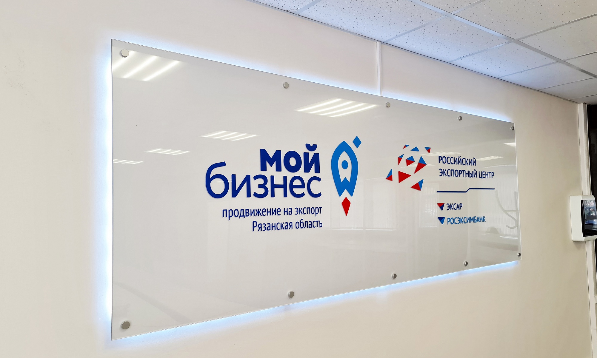 Доставка выполнена по адресу: г. Рязань, ул. Каширина, 1Б. Установка произведена внутри здания: табличка закреплена на стену с помощью надёжных металлических держателей, которые обеспечили прочность и эстетичный внешний вид конструкции.
