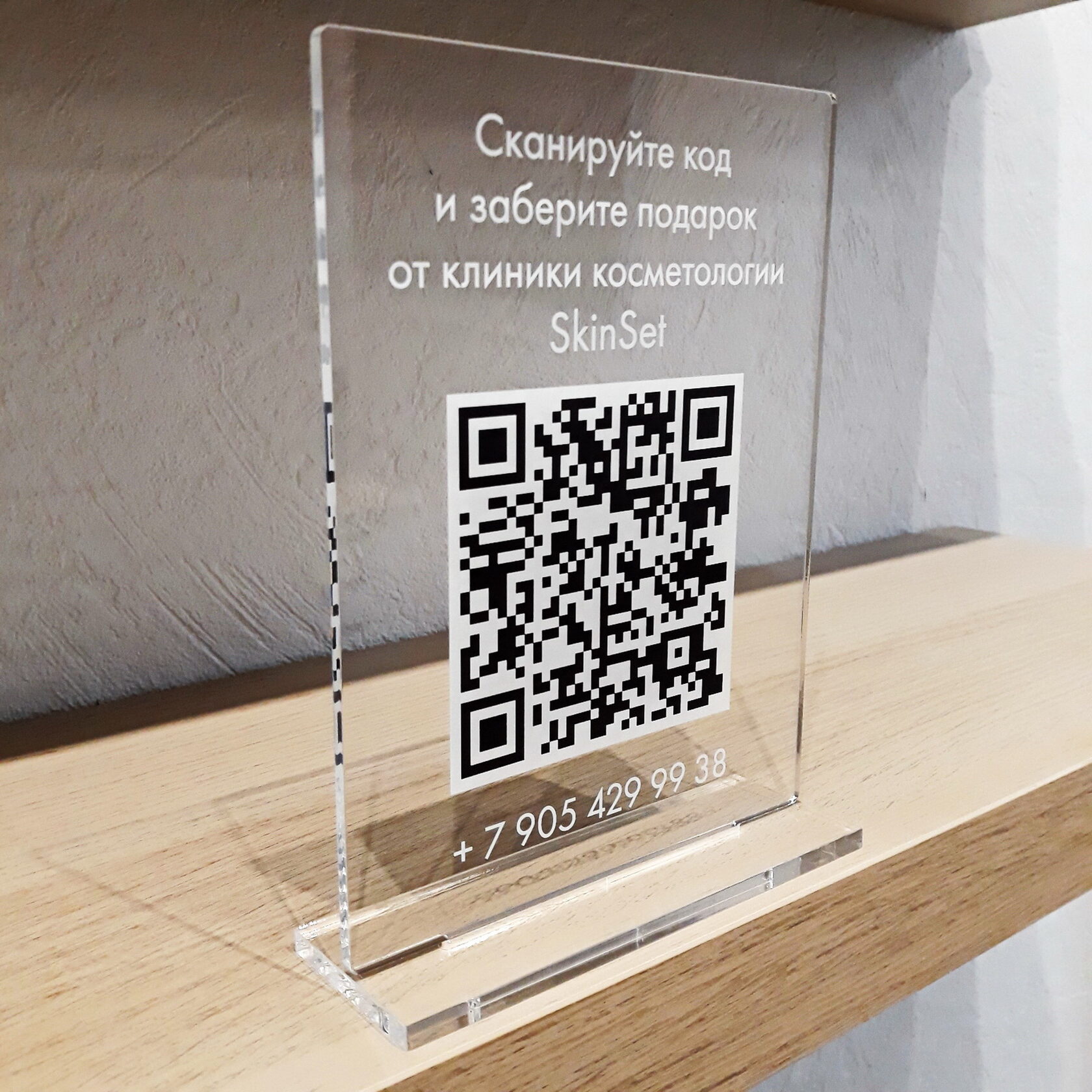 Заказчик — клиника косметологии — обратился к нам для изготовления акриловой таблички с QR-кодом для размещения на ресепшене.