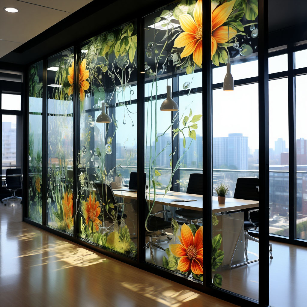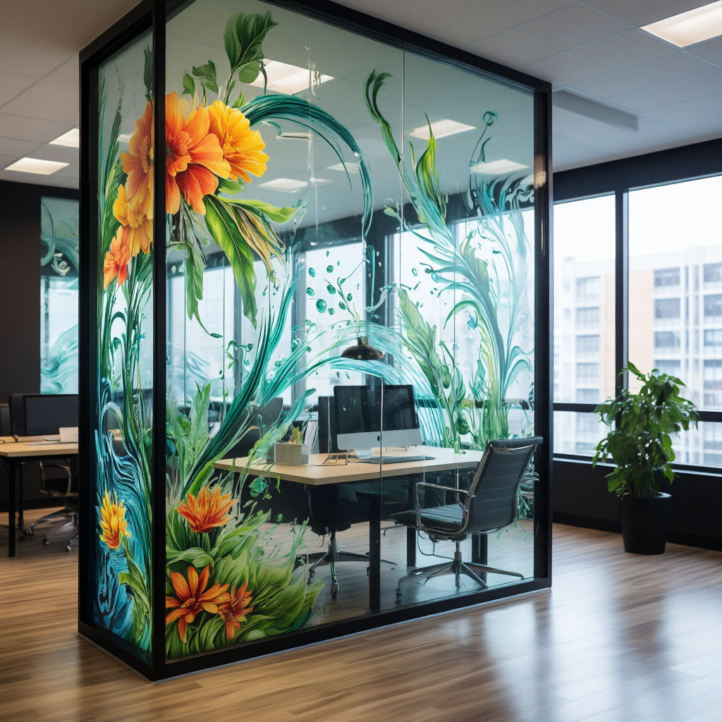 Для проекта была использована высококачественная самоклеящаяся виниловая плёнка с гладкой поверхностью и хорошей адгезией. На неё методом прямой УФ-печати нанесено оформление: логотип компании и круглый элемент с чёрными буквами, выполненные в фирменной цветовой гамме (белый и жёлтый). Технология печати позволила добиться насыщенных оттенков, высокой детализации и стойкости изображения к выцветанию, влаге и истиранию.