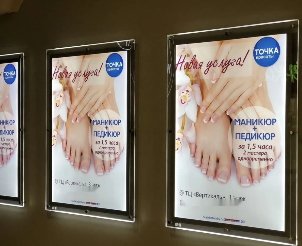 В индустрии красоты и ритейле тонкие панели применяют для демонстрации акционных предложений, причесок, косметики или одежды. Их можно разместить в витринах, зоне ресепшена или в торговом зале. Crystalight не только рекламируют услуги, но и создают приятную атмосферу, подчеркивая стиль заведения.